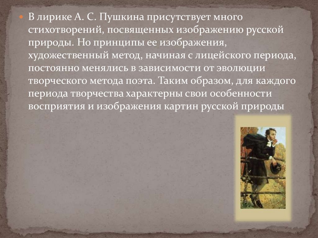 В лирике А. С. Пушкина присутствует многостихотворений, посвященных изображению русской