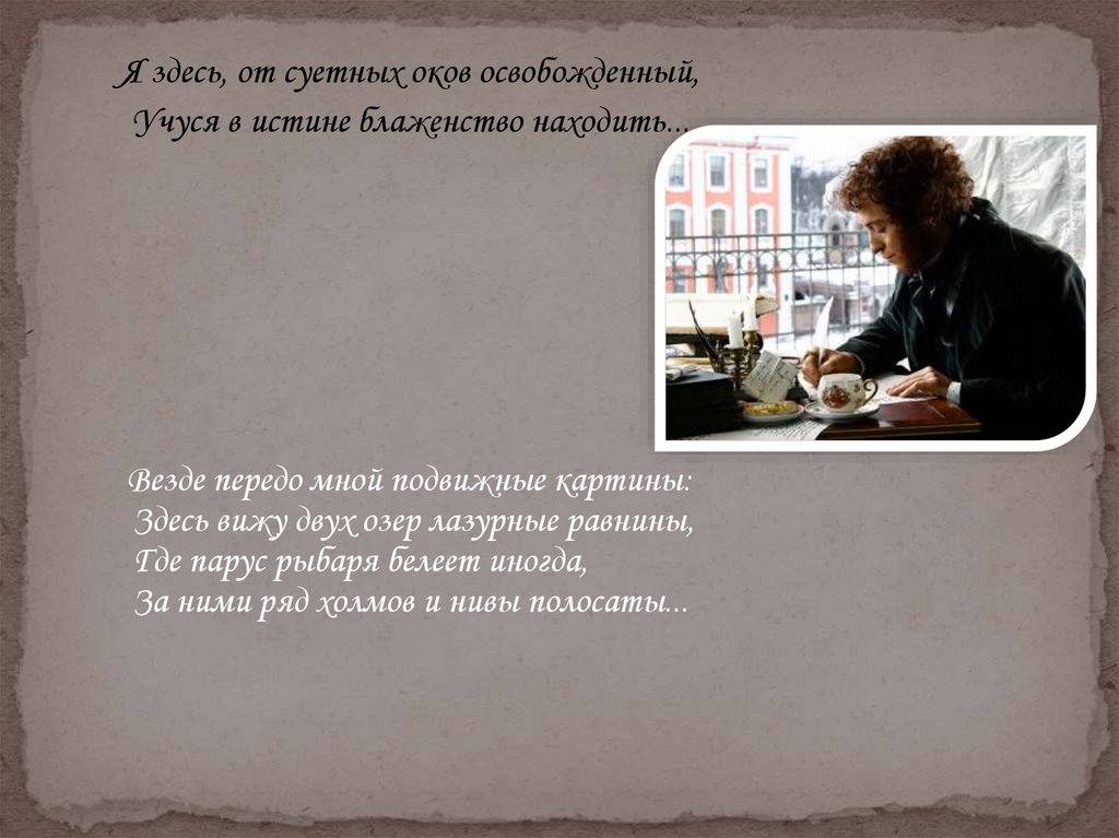 Я здесь, от суетных оков освобожденный,Учуся в истине блаженство находить...