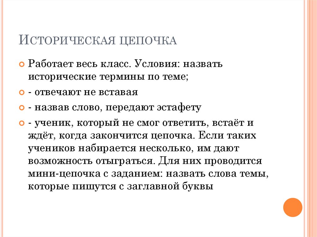 ИСТОРИЧЕСКАЯ ЦЕПОЧКАРаботает весь класс. Условия: назвать
