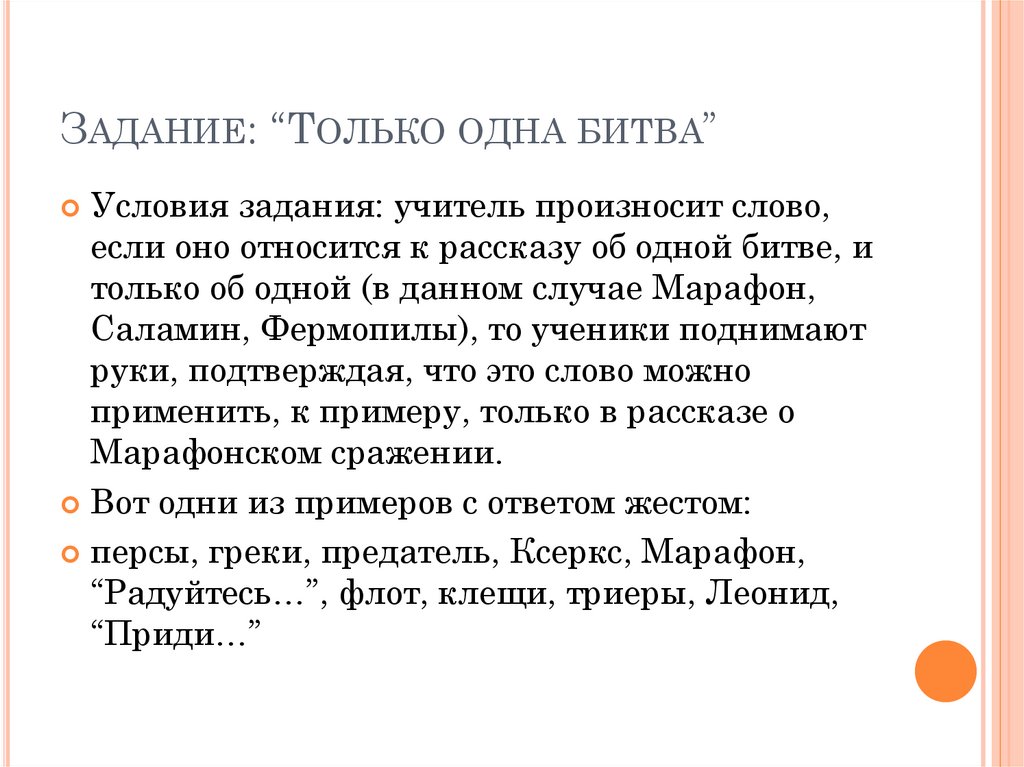 ЗАДАНИЕ: “ТОЛЬКО ОДНА БИТВА”Условия задания: учитель произносит слово,