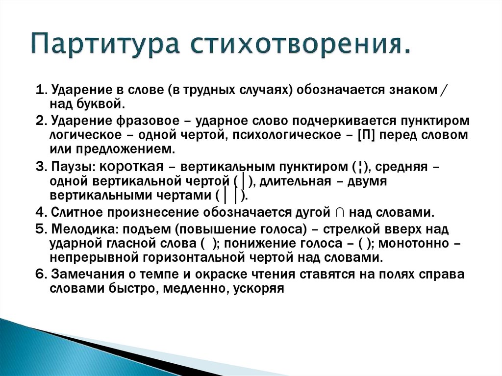 6. Замечания о темпе и окраске чтения ставятся на полях справа