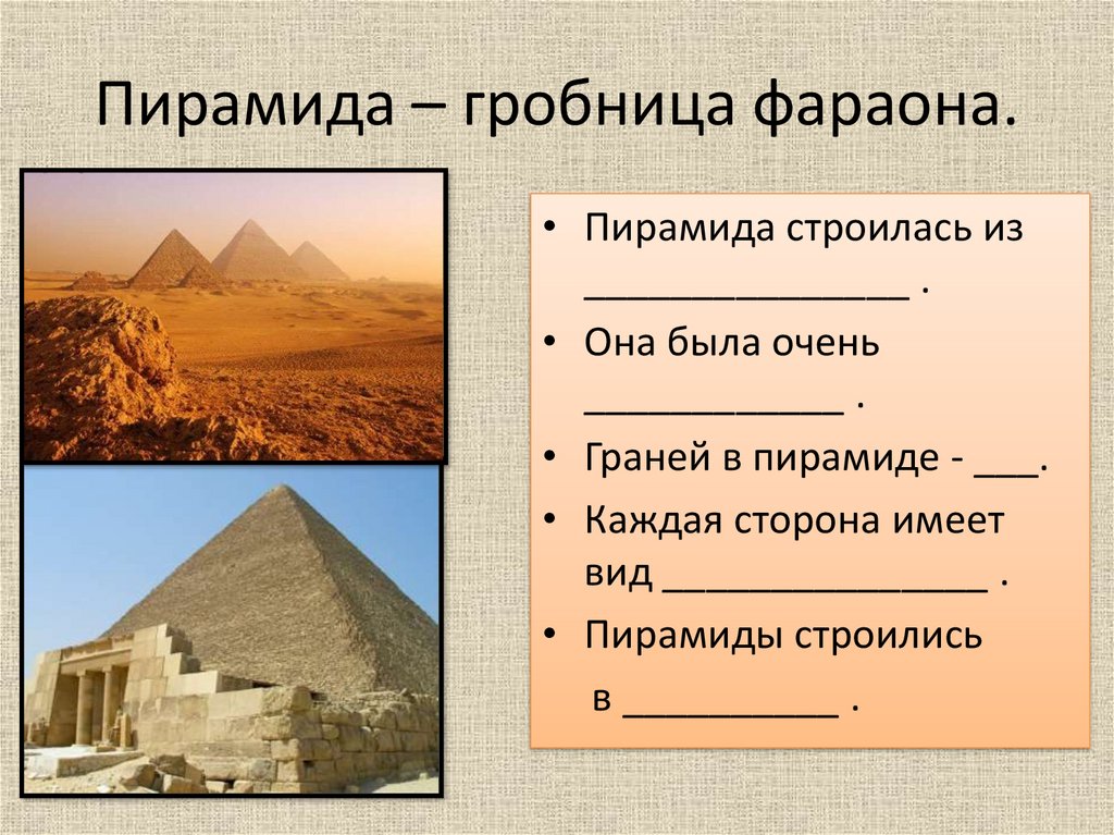 Пирамида – гробница фараона.• Пирамида строилась из