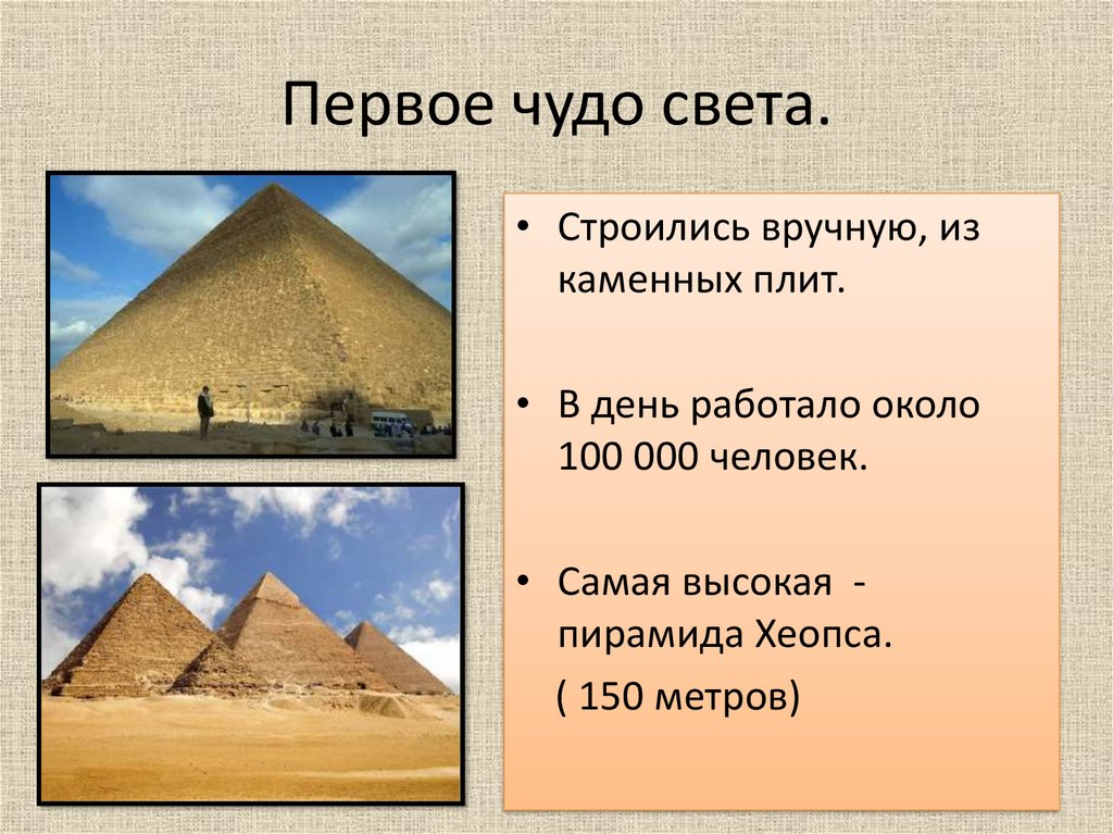 Первое чудо света.• Строились вручную, из