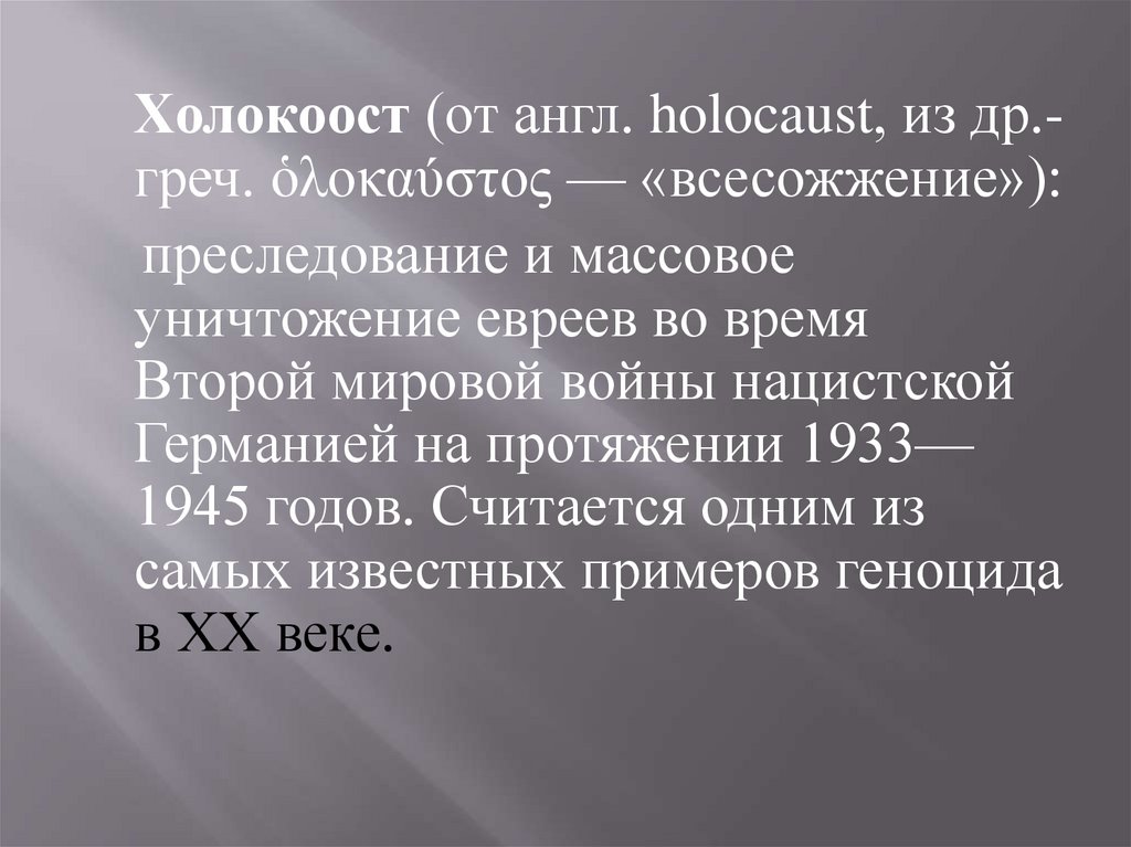 Холокоост (от англ. holocaust, из др.греч. ὁλοκαύστος — «всесожжение»):преследование и массовое