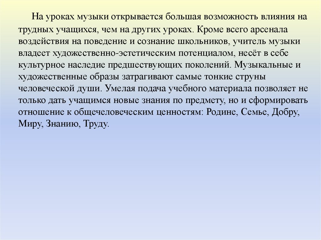 На уроках музыки открывается большая возможность влияния натрудных учащихся, чем на других уроках. Кроме всего арсенала