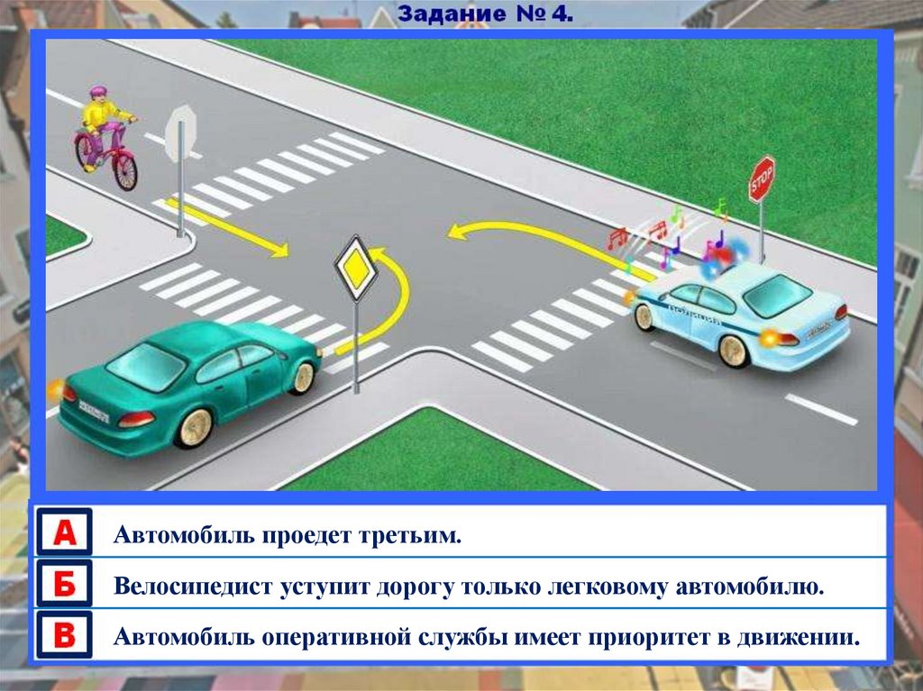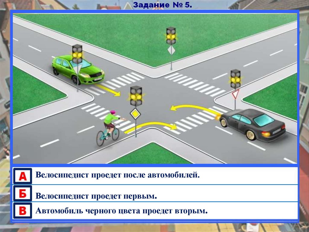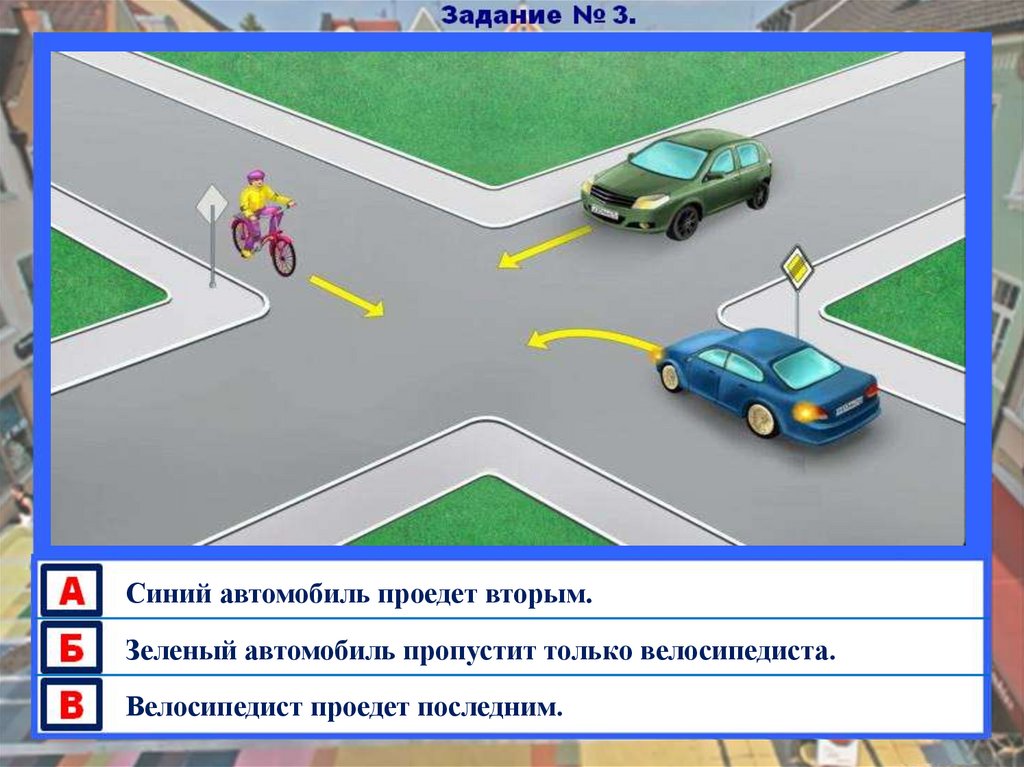 Синий автомобиль проедет вторым.Зеленый автомобиль пропустит только велосипедиста.