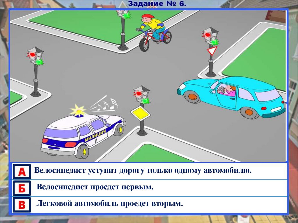 Велосипедист проедет после автомобилей.Велосипедист проедет первым.