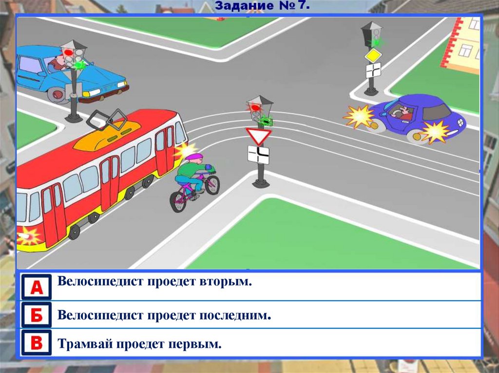 Велосипедист проедет вторым.Велосипедист проедет последним.
