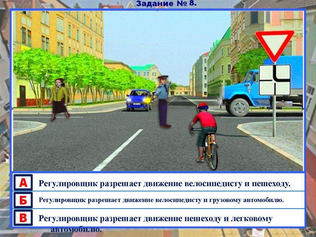 Регулировщик разрешает движение велосипедисту и пешеходу.Регулировщик разрешает движение велосипедисту и грузовому автомобилю.