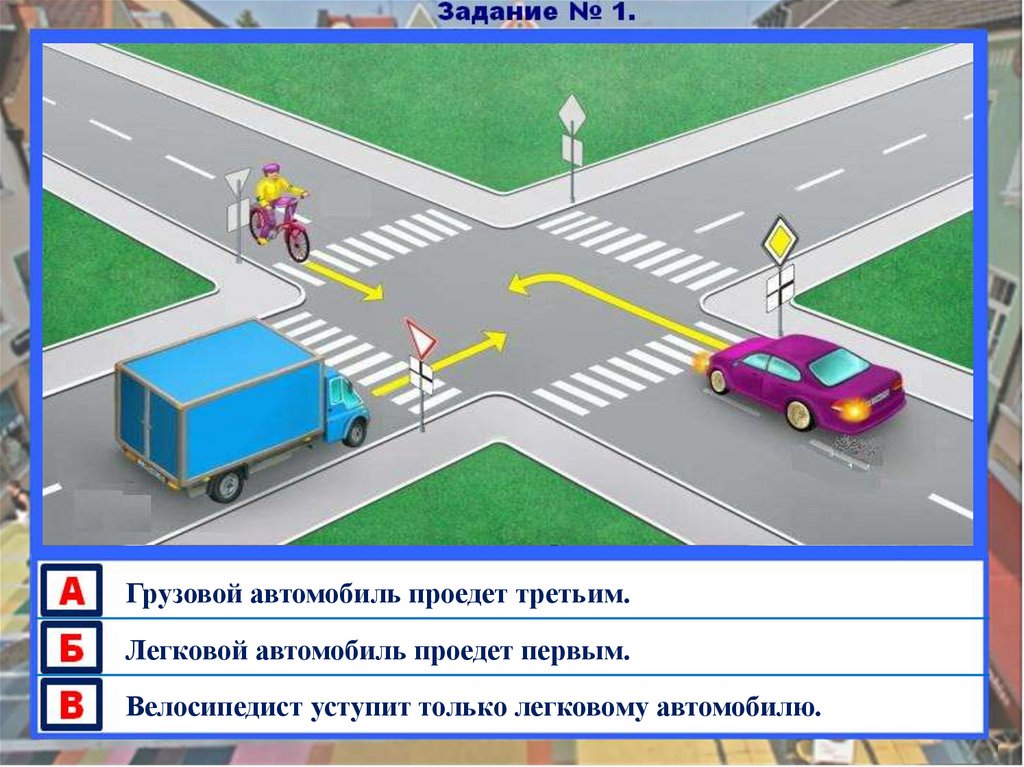 Грузовой автомобиль проедет третьим.Легковой автомобиль проедет первым.
