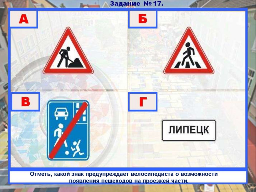 Отметь, какой знак предупреждает велосипедиста о возможностипоявления пешеходов на проезжей части.