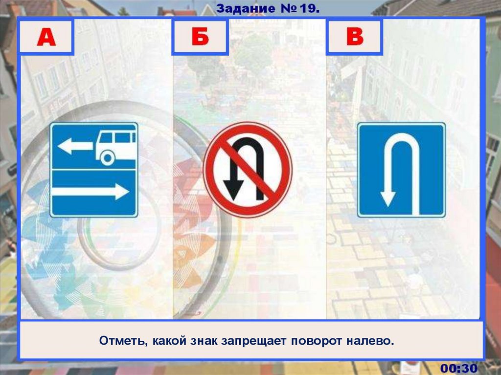Отметь, какой знак запрещает поворот налево.00:30