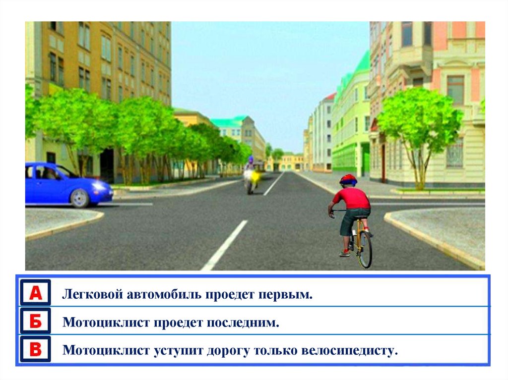 Легковой автомобиль проедет первым.Мотоциклист проедет последним.