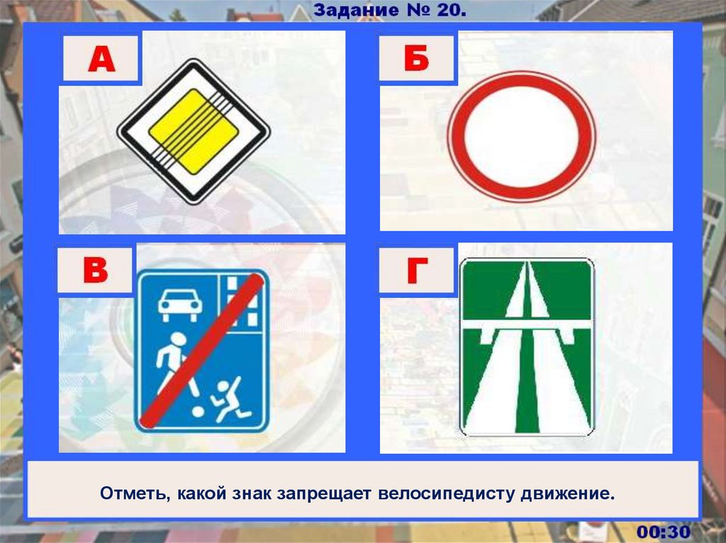 Отметь, какой знак запрещает велосипедисту движение.00:30