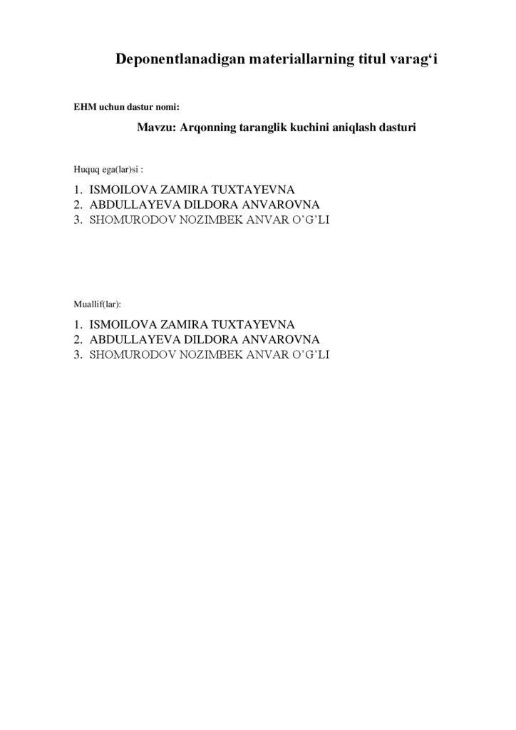 Deponentlanadigan materiallarning titul varag‘iEHM uchun dastur nomi: