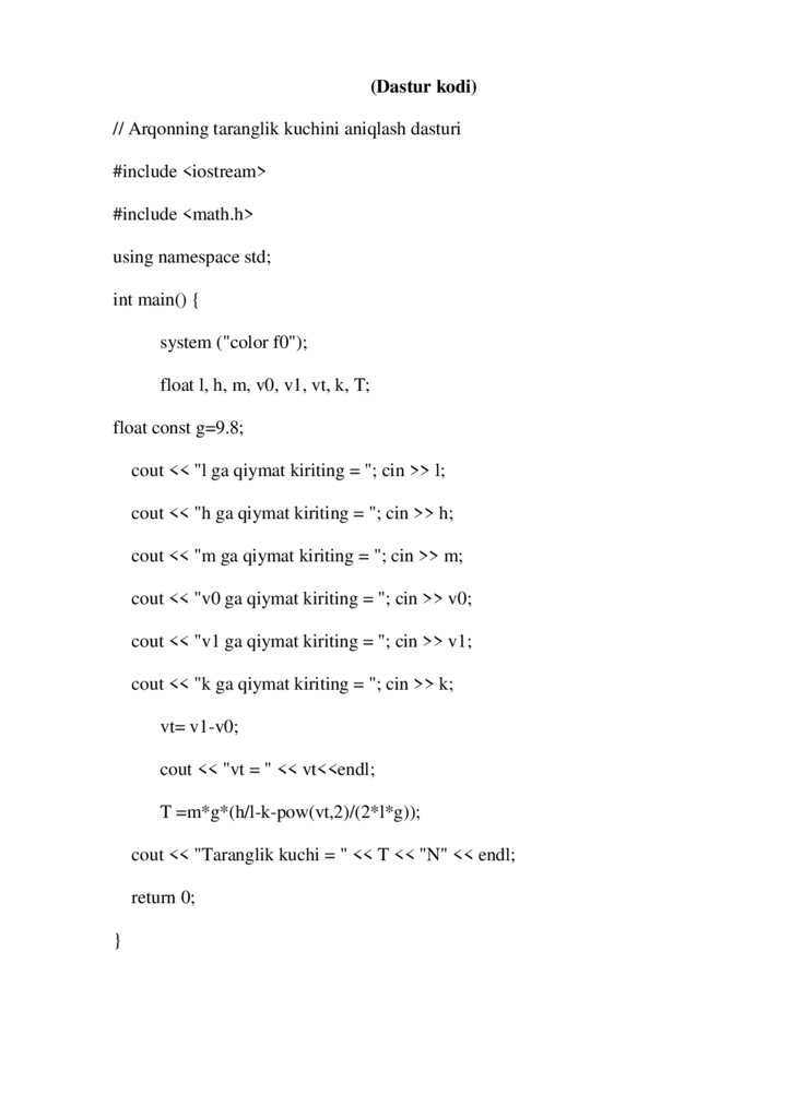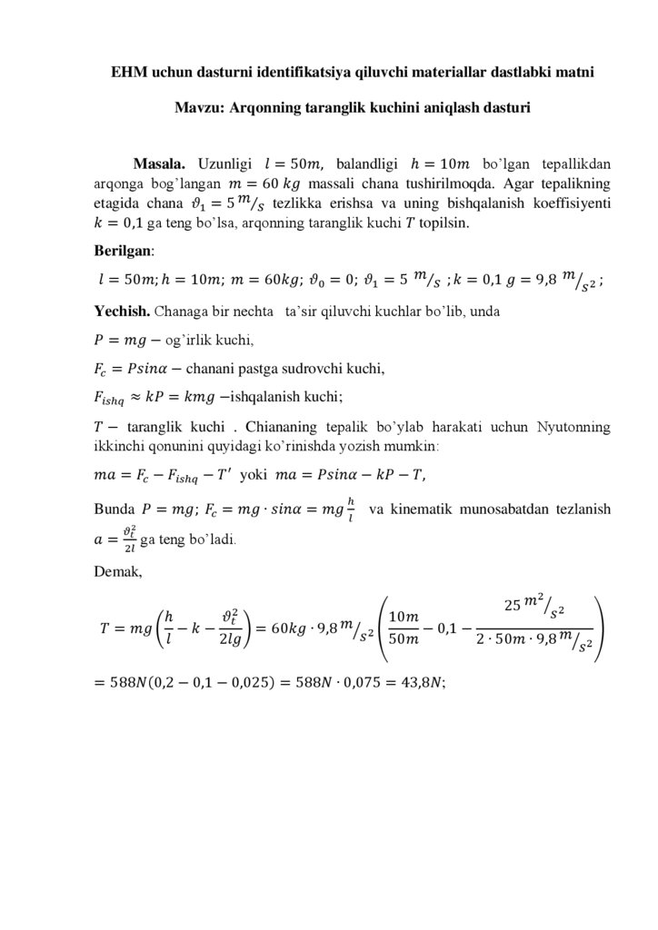 EHM uchun dasturni identifikatsiya qiluvchi materiallar dastlabki matniMavzu: Arqonning taranglik kuchini aniqlash dasturi