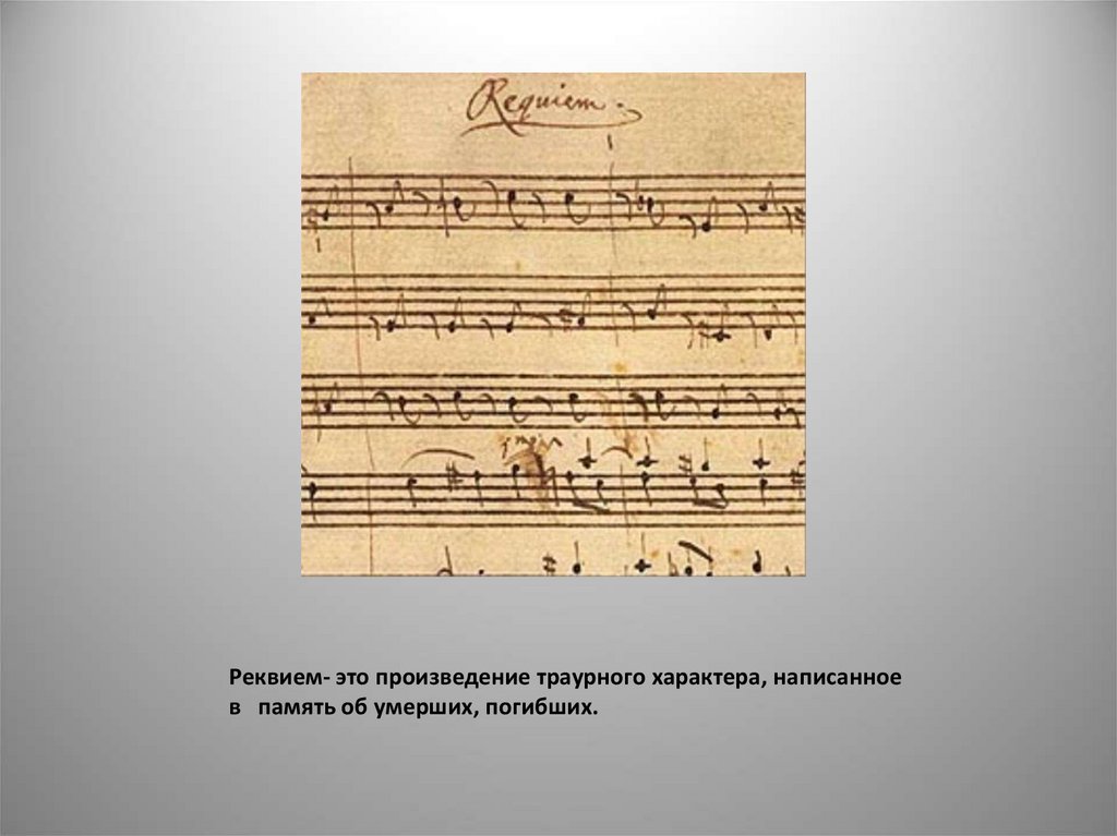 Реквием- это произведение траурного характера, написанноев память об умерших, погибших.