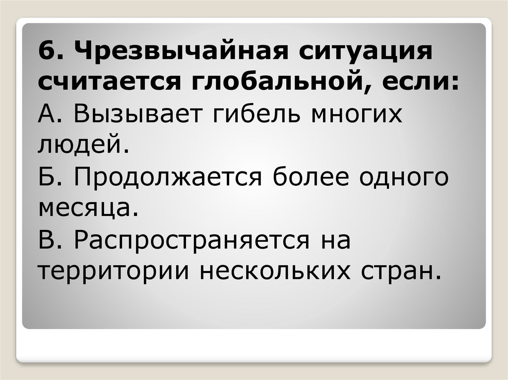 6. Чрезвычайная ситуациясчитается глобальной, если: