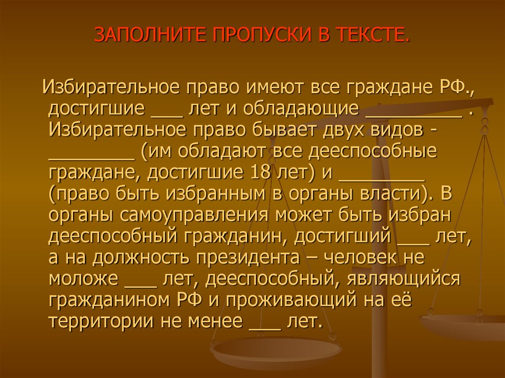 ЗАПОЛНИТЕ ПРОПУСКИ В ТЕКСТЕ.Избирательное право имеют все граждане РФ.,
