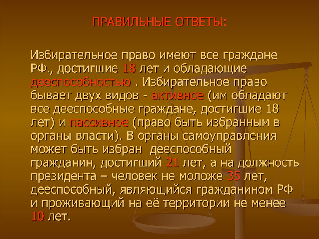 ПРАВИЛЬНЫЕ ОТВЕТЫ:Избирательное право имеют все граждане