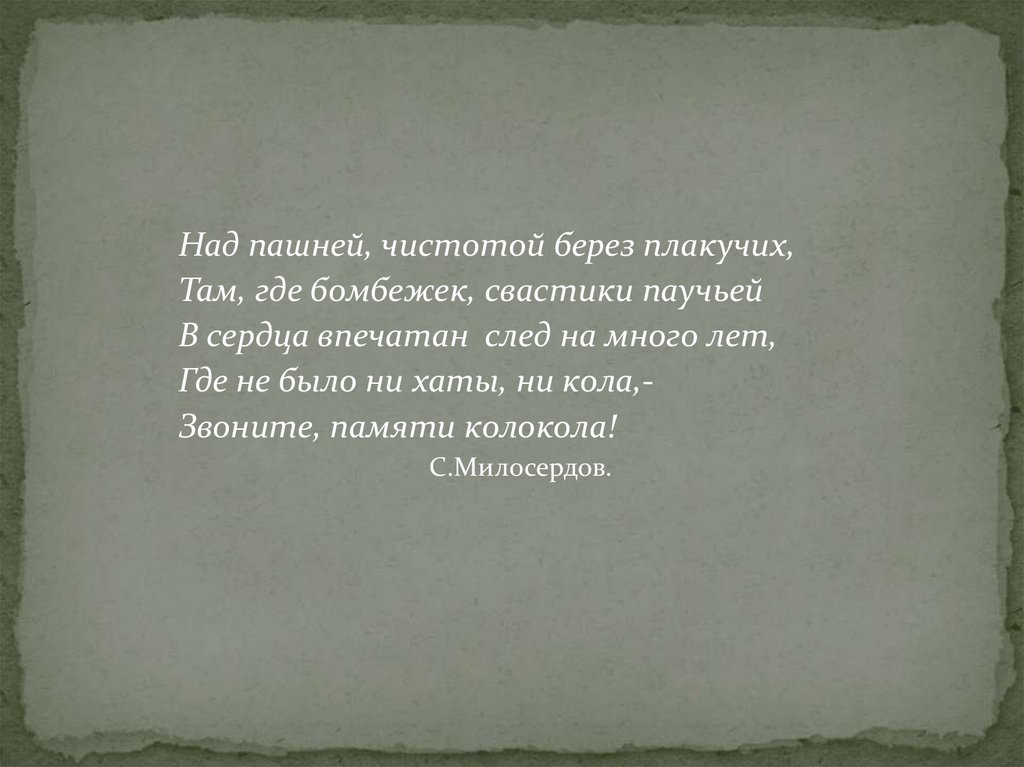 Где не было ни хаты, ни кола,Звоните, памяти колокола!