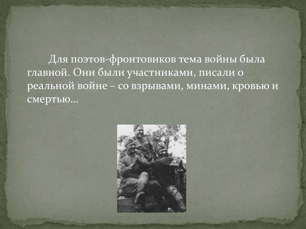 Для поэтов-фронтовиков тема войны былаглавной. Они были участниками, писали о