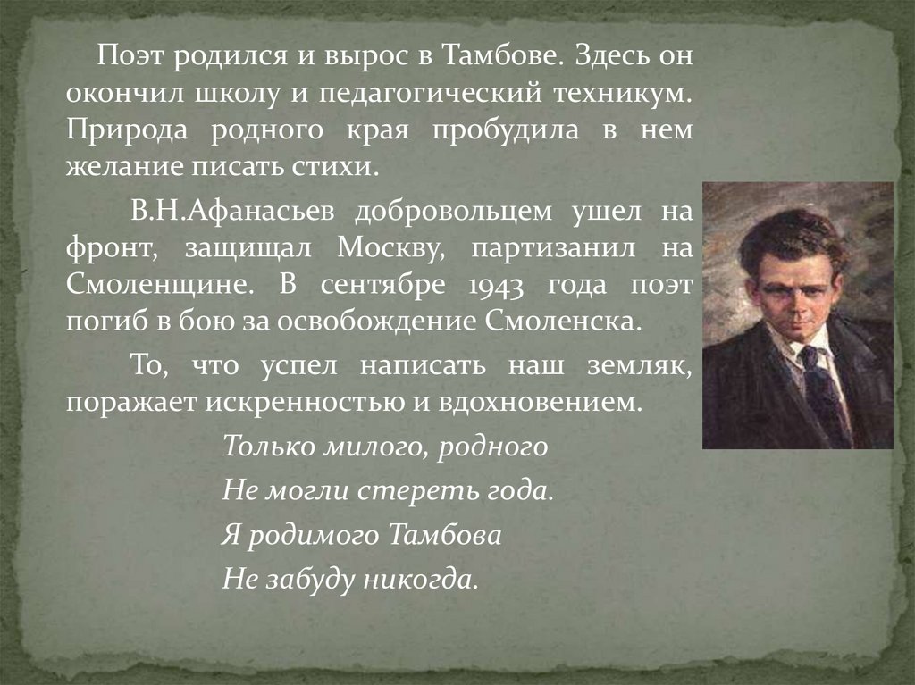Поэт родился и вырос в Тамбове. Здесь онокончил школу и педагогический техникум.