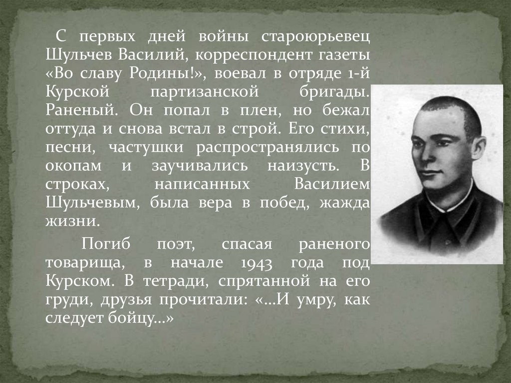 С первых дней войны староюрьевецШульчев Василий, корреспондент газеты