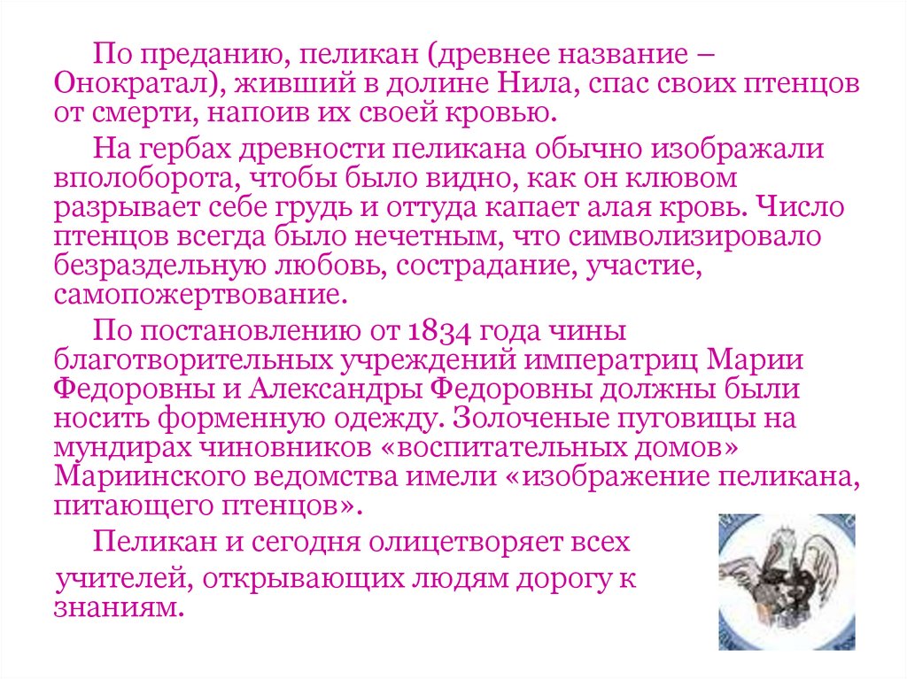 По преданию, пеликан (древнее название –Онократал), живший в долине Нила, спас своих птенцов