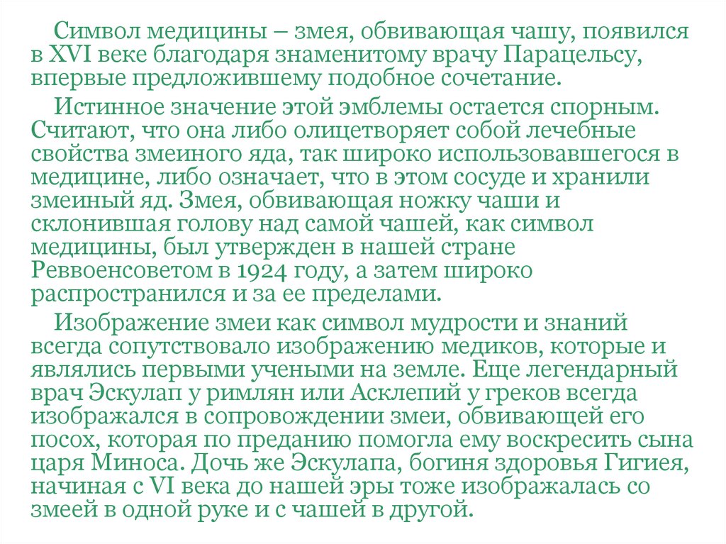 Символ медицины – змея, обвивающая чашу, появилсяв XVI веке благодаря знаменитому врачу Парацельсу,