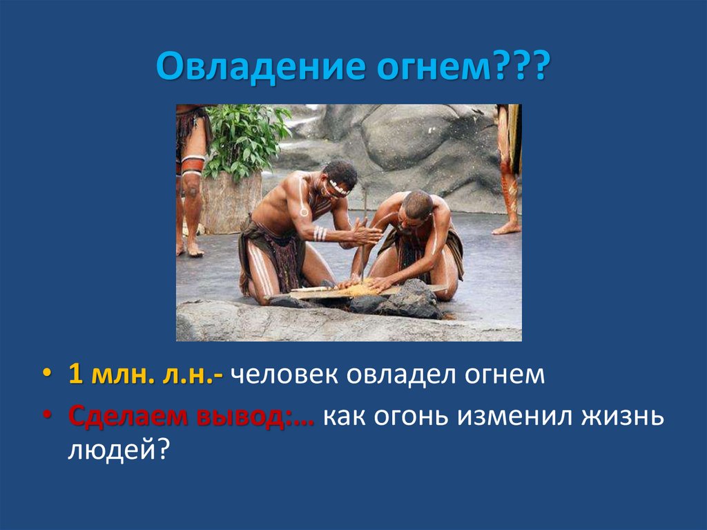 Овладение огнем???• 1 млн. л.н.- человек овладел огнем