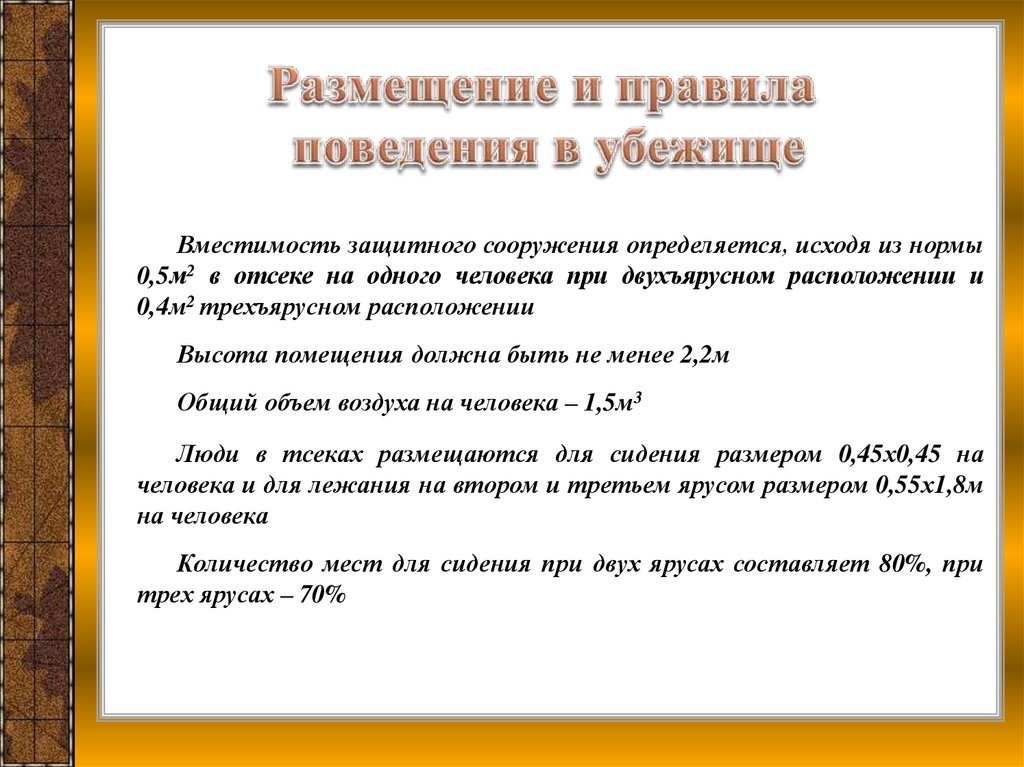 Вместимость защитного сооружения определяется, исходя из нормы0,5м2 в отсеке на одного человека при двухъярусном расположении и