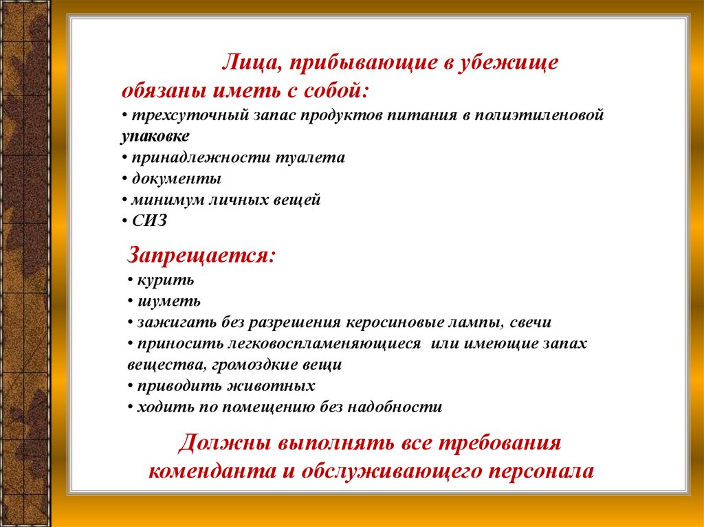 Лица, прибывающие в убежищеобязаны иметь с собой: