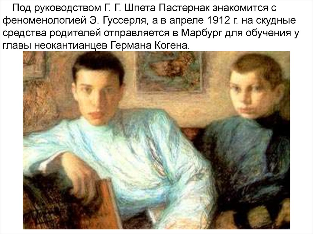 Под руководством Г. Г. Шпета Пастернак знакомится сфеноменологией Э. Гуссерля, а в апреле 1912 г. на скудные