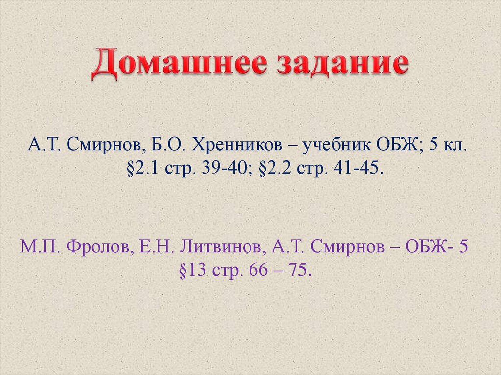 А.Т. Смирнов, Б.О. Хренников – учебник ОБЖ; 5 кл.§2.1 стр. 39-40; §2.2 стр. 41-45.