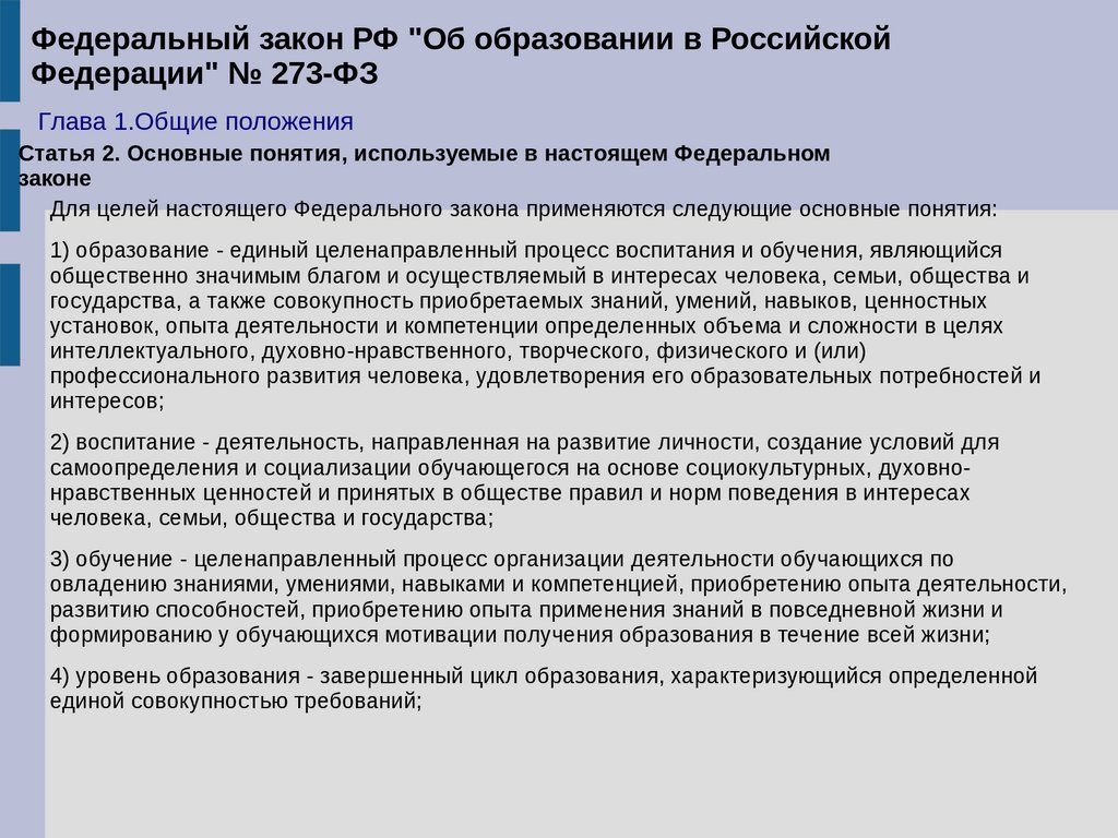 1) образование - единый целенаправленный процесс воспитания и обучения, являющийся