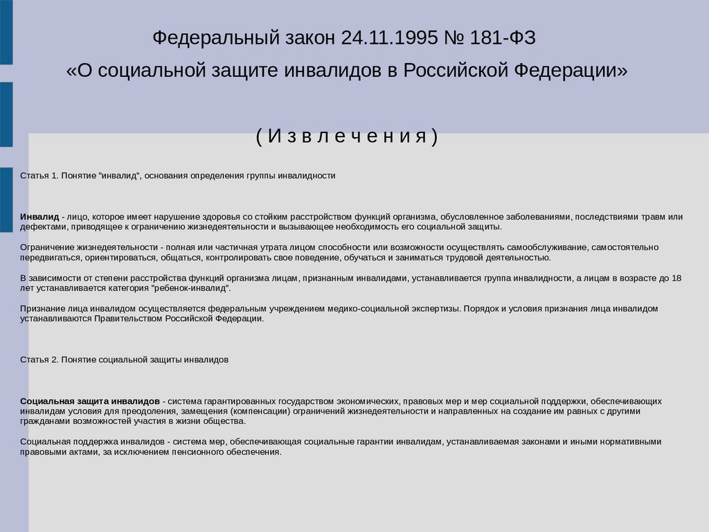 Социальная поддержка инвалидов - система мер, обеспечивающая социальные гарантии инвалидам, устанавливаемая законами и иными нормативными