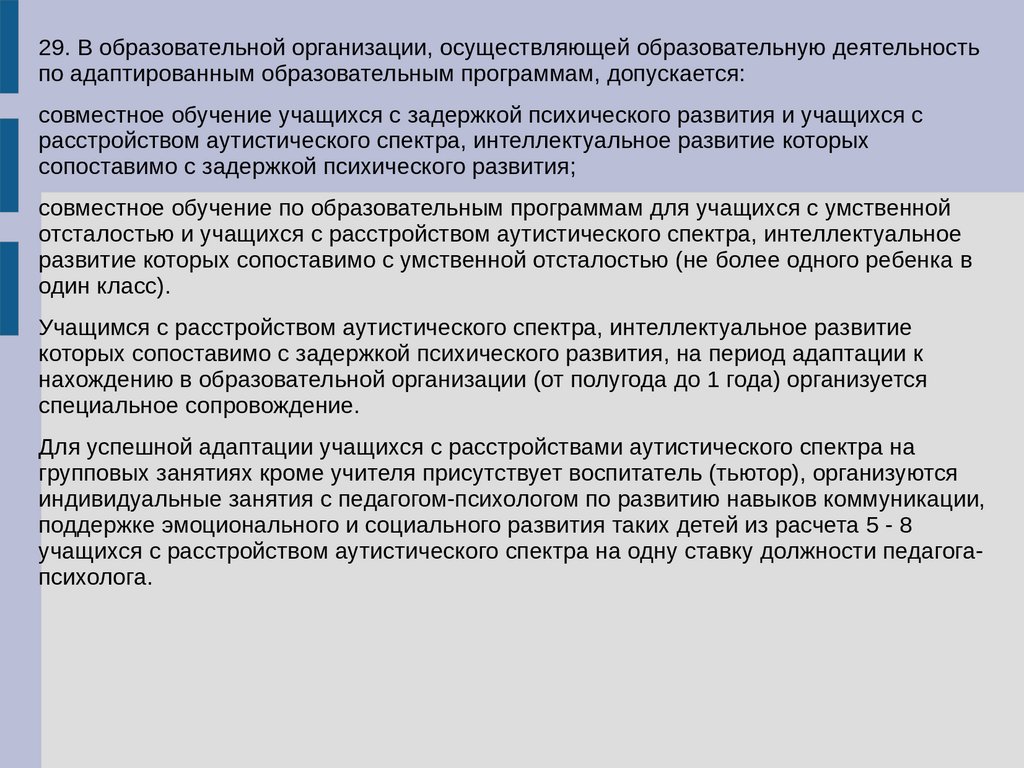 29. В образовательной организации, осуществляющей образовательную деятельностьпо адаптированным образовательным программам, допускается: