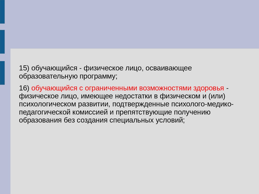 16) обучающийся с ограниченными возможностями здоровья физическое лицо, имеющее недостатки в физическом и (или)