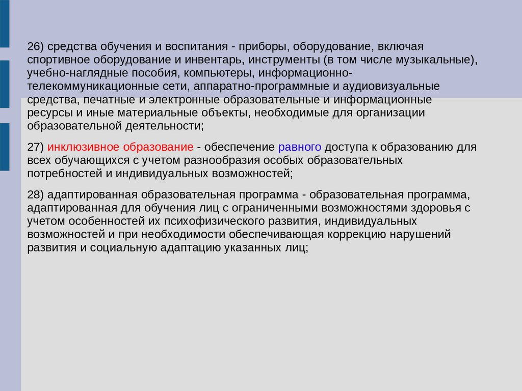 26) средства обучения и воспитания - приборы, оборудование, включаяспортивное оборудование и инвентарь, инструменты (в том числе музыкальные),