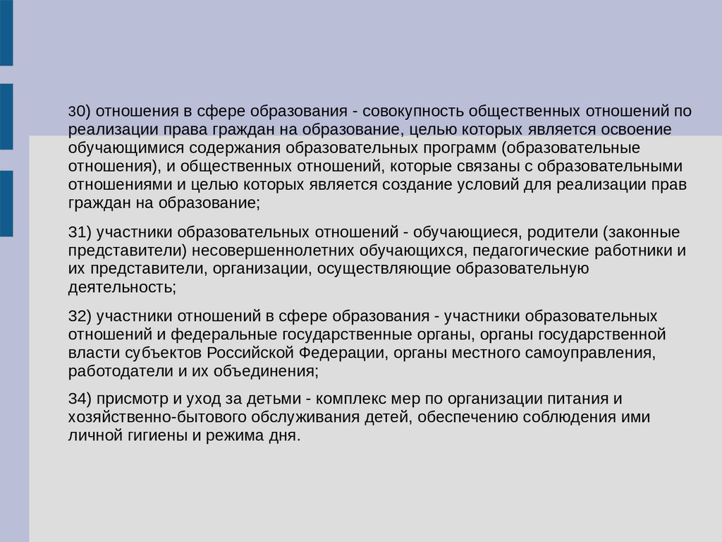30) отношения в сфере образования - совокупность общественных отношений пореализации права граждан на образование, целью которых является освоение