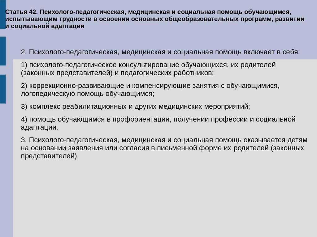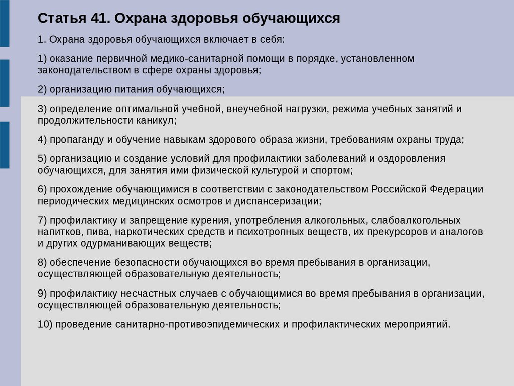Статья 41. Охрана здоровья обучающихся1. Охрана здоровья обучающихся включает в себя: