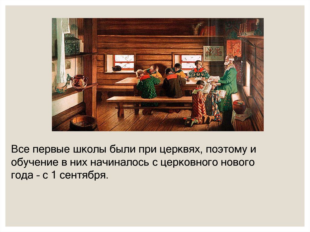 Все первые школы были при церквях, поэтому иобучение в них начиналось с церковного нового