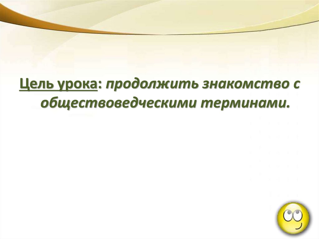 Цель урока: продолжить знакомство собществоведческими терминами.