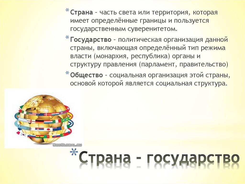 * Страна – часть света или территория, котораяимеет определённые границы и пользуется