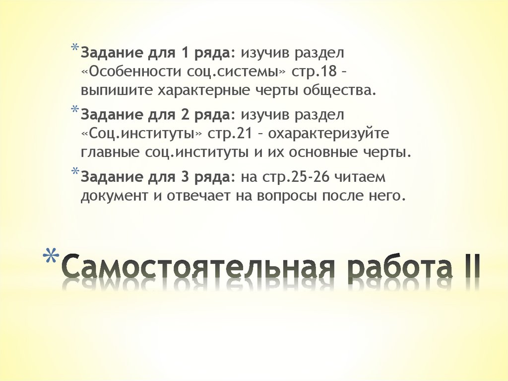 * Задание для 1 ряда: изучив раздел«Особенности соц.системы» стр.18 –