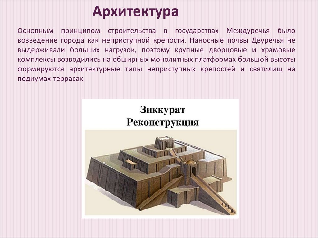 АрхитектураОсновным принципом строительства в государствах Междуречья было