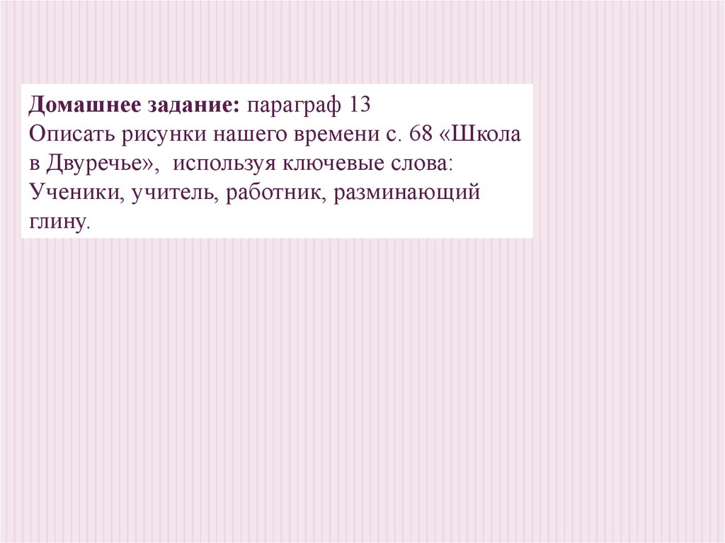 Домашнее задание: параграф 13Описать рисунки нашего времени с. 68 «Школа