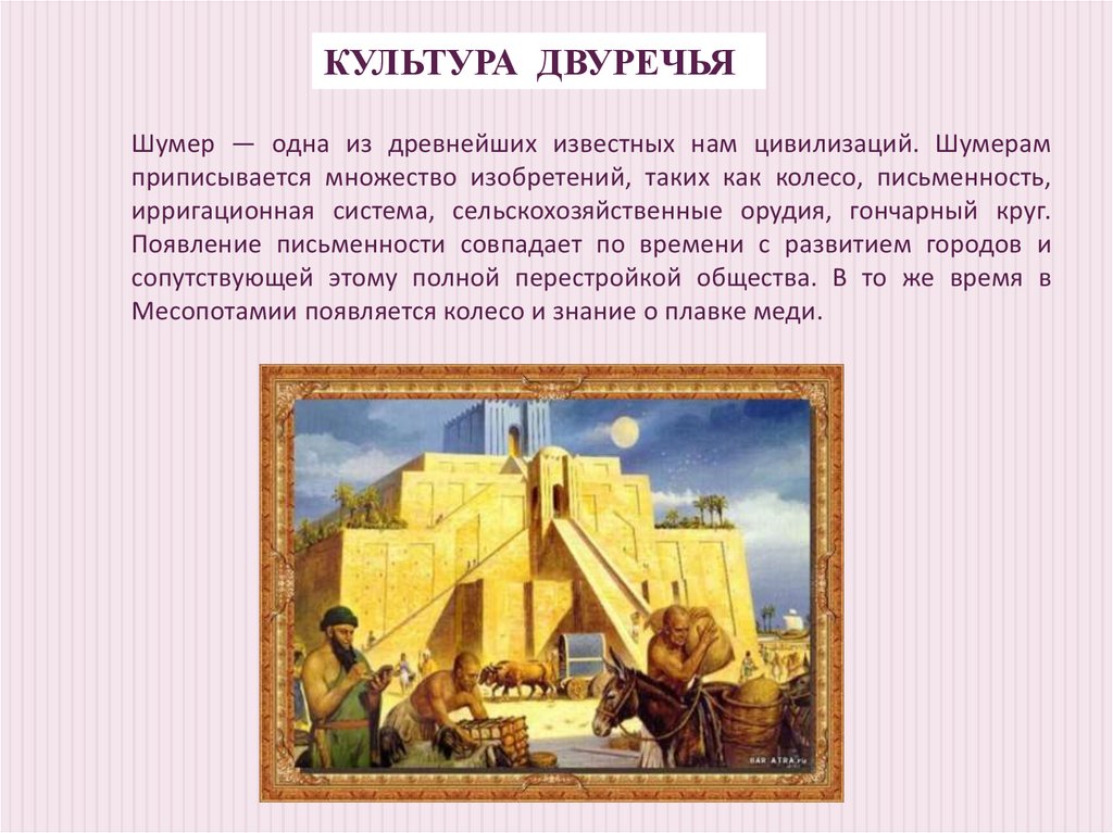 КУЛЬТУРА ДВУРЕЧЬЯШумер — одна из древнейших известных нам цивилизаций. Шумерам