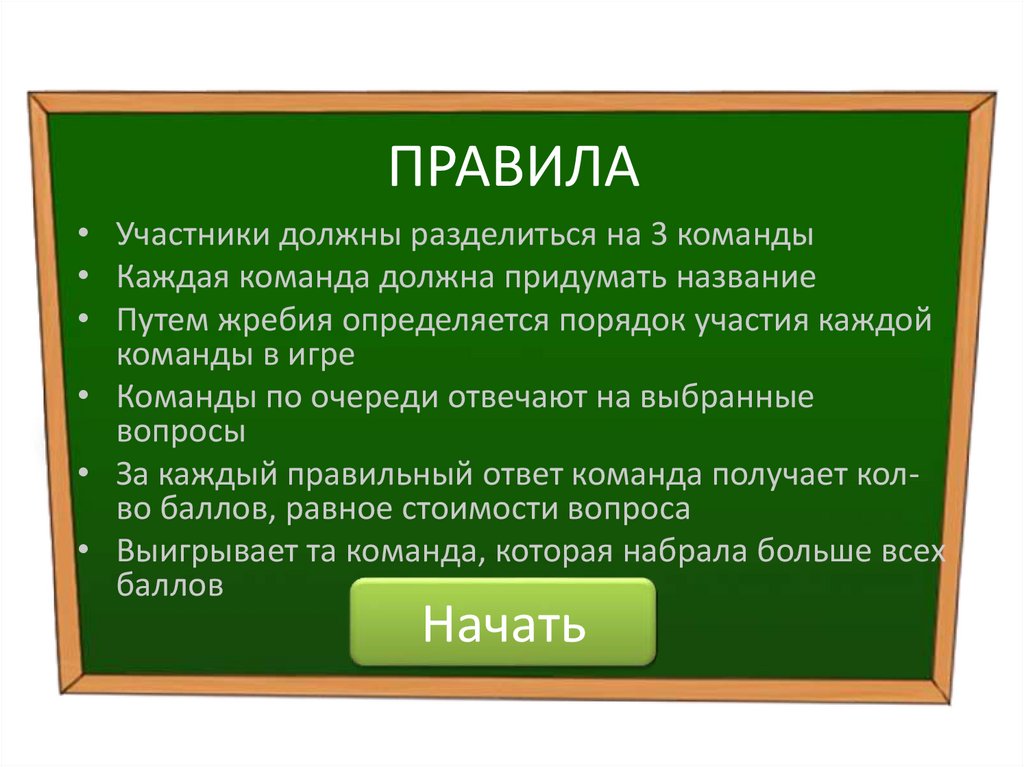 • За каждый правильный ответ команда получает колво баллов, равное стоимости вопроса